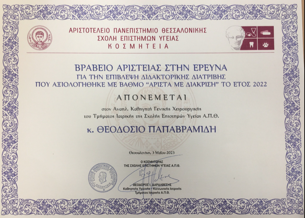 Για πέμπτη συνεχόμενη χρονιά ήταν μεγάλη τιμή για μας που λάβαμε δύο βραβεία αριστείας στην έρευνα από την κοσμητεία της Ιατρικής σχολής του ΑΠΘ.